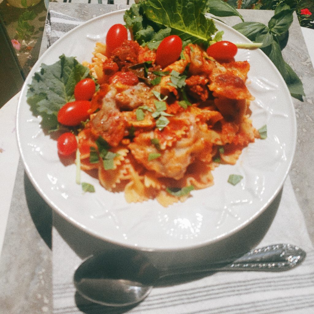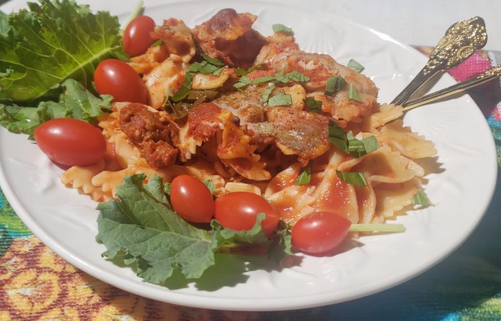 Plant based whole food eating never tasted so good! Bowtie Pasta in Red Basil Sauce is a hardy meal that will feed a whole family or provide a single eater a week's worth of meals. The recipe above has Veggie meatballs and vegan sausage to add a boost of flavor to the sauce. I used Gardein Plant-Based, Vegan Classic Meatless Meatballs and Morning Star Veggie sausage but there are many options available that are amazing! I swear I could not taste the difference between this dish and the pasta I used to make for my kids years ago with real hamburger meat, only that it's less heavy and cleaner tasting, if that makes sense. This dish is wonderful to feed a crowd because it makes 8-10 servings and is easily freezable for those on the go lunches.